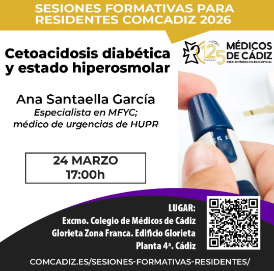 Consiste en una actividad totalmente gratuita para las personas colegiadas en el Colegio de Médicos de Cádiz. Conforme a la formación, se abordará específicamente sobre la Cetoacidosis diabética y estado hiperosmolar.