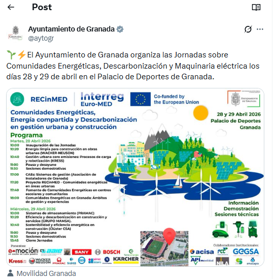 El Ayuntamiento de Granada ha anunciado la celebración de las Jornadas sobre Comunidades Energéticas, Descarbonización y Maquinaria Eléctrica, que tendrán lugar los próximos días 28 y 29 de abril en el Palacio de Deportes de la ciudad.