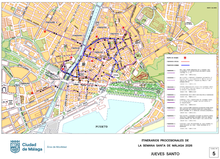 Los itinerarios, consultables a través del portal municipal, siguen el modelo tradicional de la ciudad: cada cofradía parte desde su casa hermandad o templo y se dirige al llamado “recorrido oficial”, un tramo común que atraviesa puntos emblemáticos como la Plaza de la Constitución, calle Larios, la Alameda Principal o la Plaza de la Marina.
