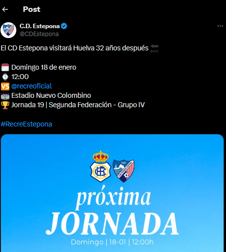 En esta jornada, el Recreativo de Huelva recibirá el domingo 18 a las 12.00 al Estepona en el Nuevo Colombino.