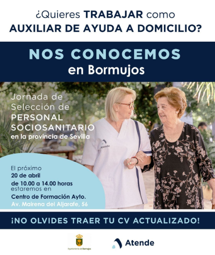 El municipio sevillano de Bormujos acogerá una jornada de selección de personal enfocada al ámbito sociosanitario, dirigida especialmente a quienes estén interesados en trabajar como Auxiliar de Ayuda a Domicilio.