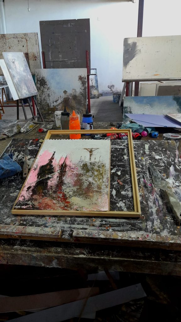 De hecho, es tal la cantidad de pintura en los cuadros que si utilizo un cúter, lo mancharía por completo. El relieve, las capas… yo los pinceles a veces ni los utilizo, para mí los cuadros son de hielo ¿por qué? porque yo uso mucha pintura y un caballete lo caería con la fuerza y la cantidad de pintura. Si me pongo un babi puedo asegurar que ya no pinto, yo no creo en el orden, yo creo en mi propio orden.