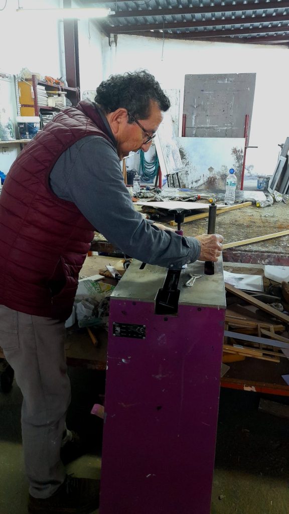 Lo que sucede es que yo no sé aquí dónde está nada. Lo dejo donde sea, nunca le asigno un sitio, aunque procuro tener buena luz y aquí me sobra. No obstante, es crucial que la luz no se proyecte de manera directa en el cuadro, ya que esto hace que te refleje y te quedes ciego por exceso de luminosidad.