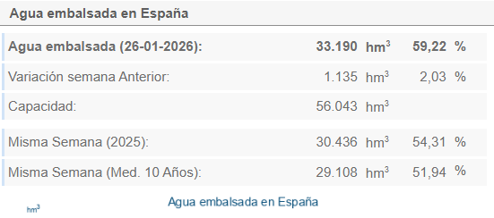 A fecha de finales de enero de 2026, la reserva hídrica española muestra una situación positiva, situándose al 59,22% de su capacidad total, con 33.190 hm³ de agua embalsada. Esta cifra representa un aumento respecto a la misma semana del año anterior (54,31%) y supera la media de los últimos diez años (51,94%), reflejando una recuperación favorable, según Embalses.net y datos del Miteco.