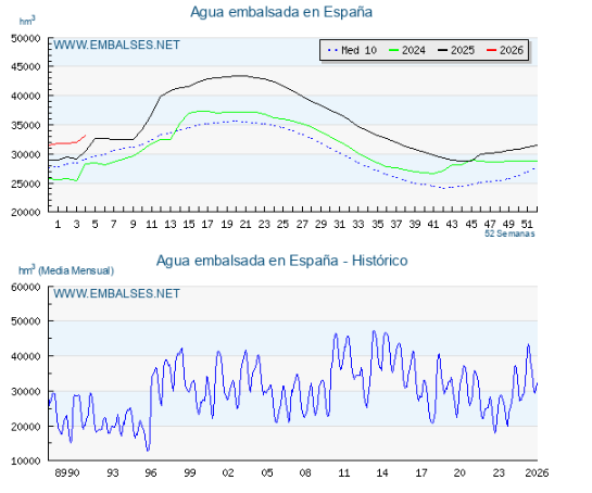 - Comparación Interanual: El volumen actual (33.190 hm³) es superior al registrado en la misma semana de 2025 (30.436 hm³).