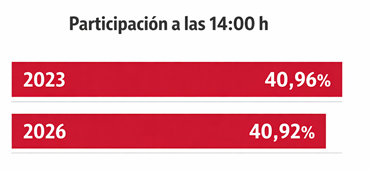 Uno de los datos más significativos de la jornada está siendo la participación. A las 14:00 horas, el porcentaje de votantes alcanzó un 40,92%, prácticamente idéntico al registrado en las elecciones de 2023, con un 40,96%.