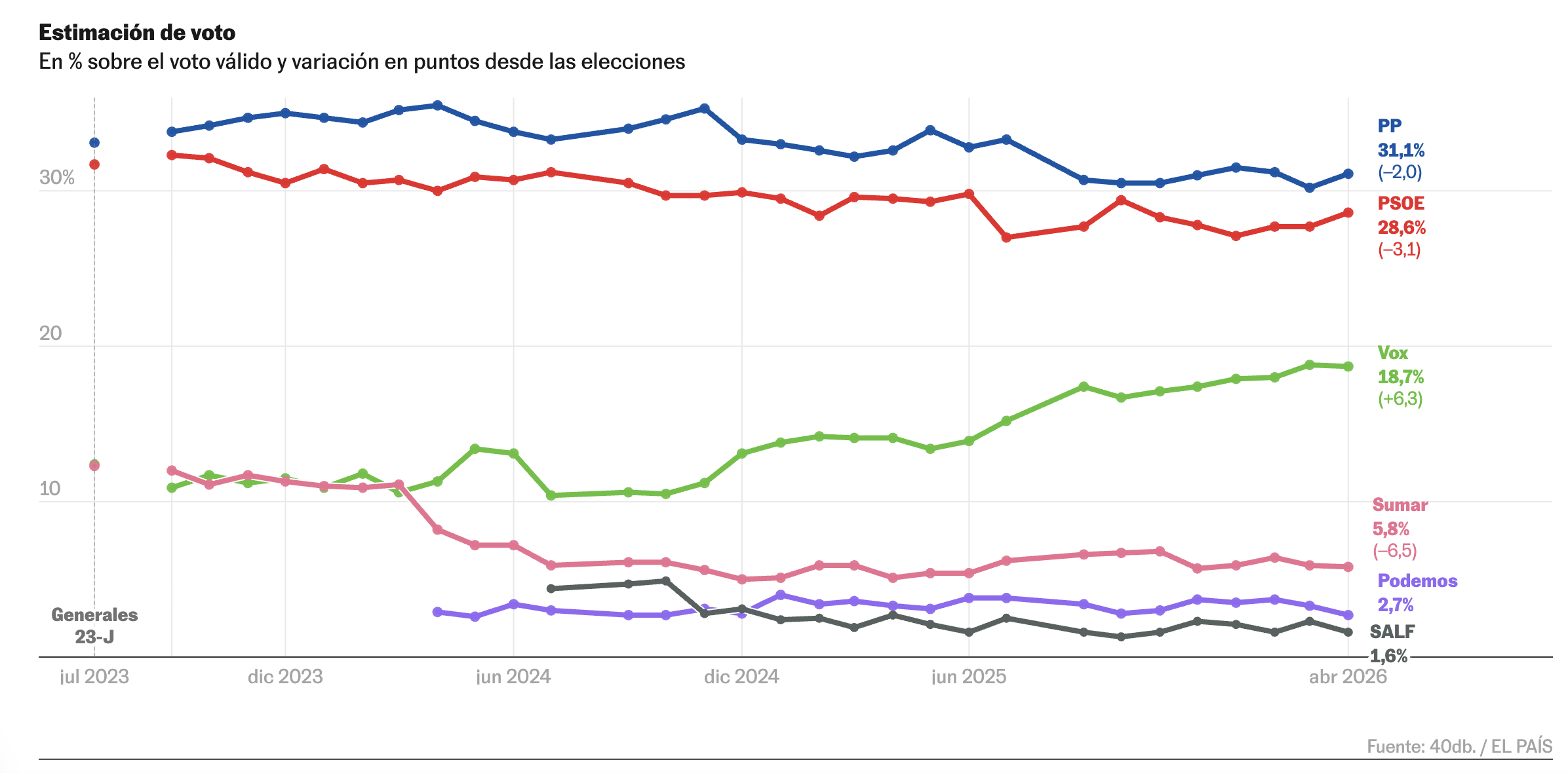 Sin embargo, ese dato no debe llevar a conclusiones precipitadas. El bloque de la derecha sigue siendo sólido, con la suma de PP y Vox en niveles que permiten aspirar a una mayoría parlamentaria.
