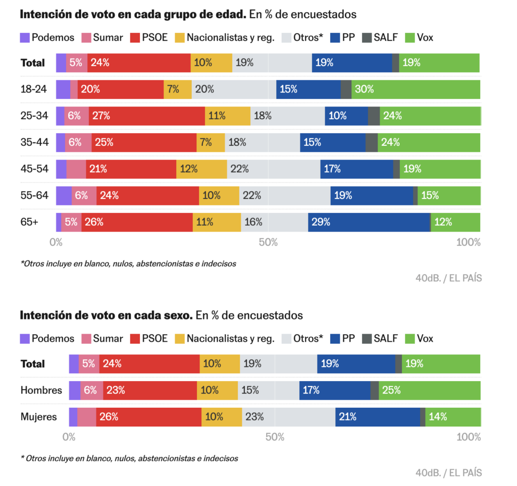 Sin embargo, ese impulso no se traslada al resto del espacio progresista. Sumar y Podemos siguen perdiendo apoyo, evidenciando una tendencia que ya se venía consolidando. La izquierda a la izquierda del PSOE no consigue reactivar su base electoral, lo que debilita el conjunto del bloque.
