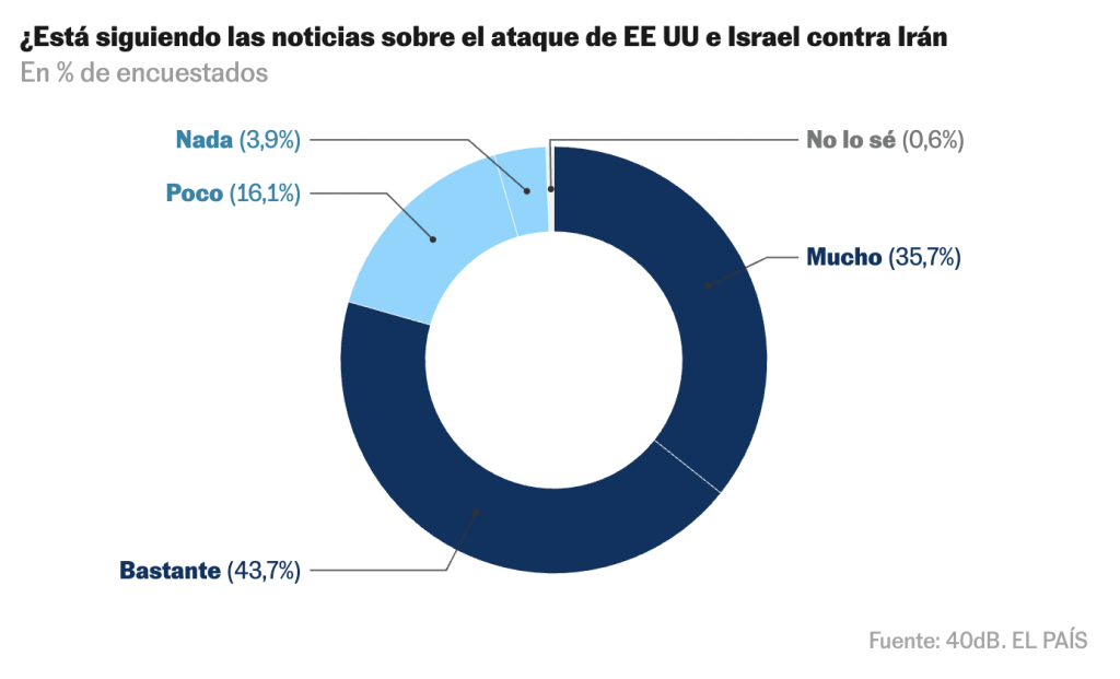 El seguimiento mediático también es muy elevado. Según el estudio, cerca del 80 % de los españoles afirma estar pendiente de la evolución de la guerra, un dato que confirma la enorme atención que está generando el conflicto.