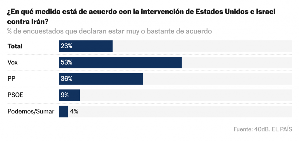 Los datos reflejan una clara posición de la opinión pública española frente a una guerra que ha vuelto a situar la tensión internacional en el centro del debate político. El rechazo se extiende además a distintos segmentos ideológicos y generacionales, lo que apunta a un consenso social amplio contra la escalada militar en Oriente Próximo.